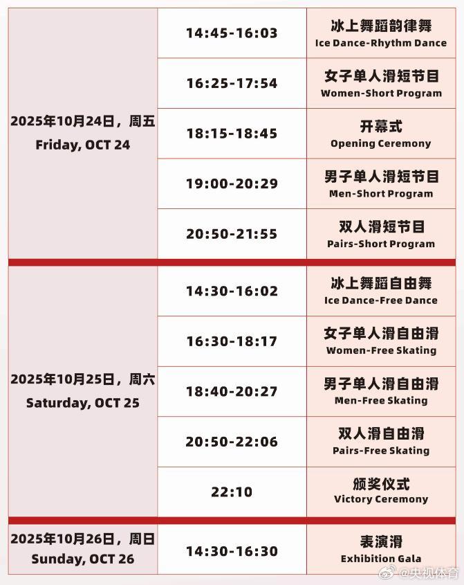 2025年中国杯花滑世界大奖赛将于10月24日至26日在重庆举行。 17岁的张瑞阳将参加女子组比赛。 在上个月的奥运会资格赛中,张瑞阳凭借出色的表现,成功为中国队赢得了女子单滑重要的冬奥会席位。 △ 中国杯赛程